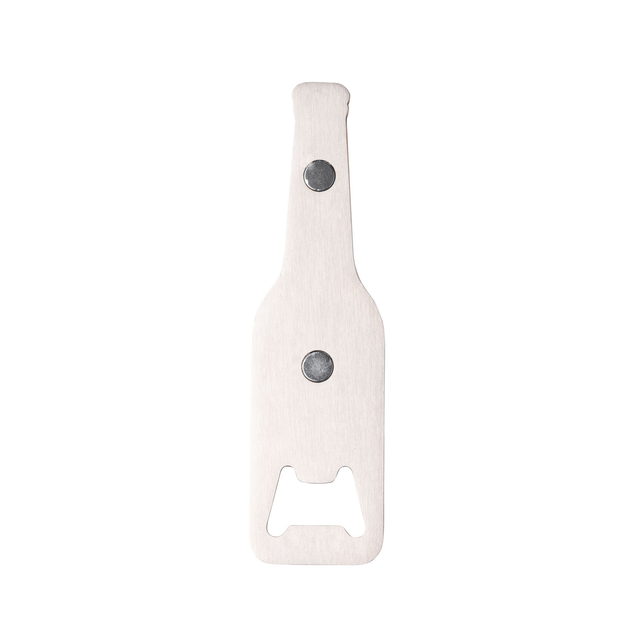 Abridor con forma de botella. Cuerpo de bambú y metal con imán.