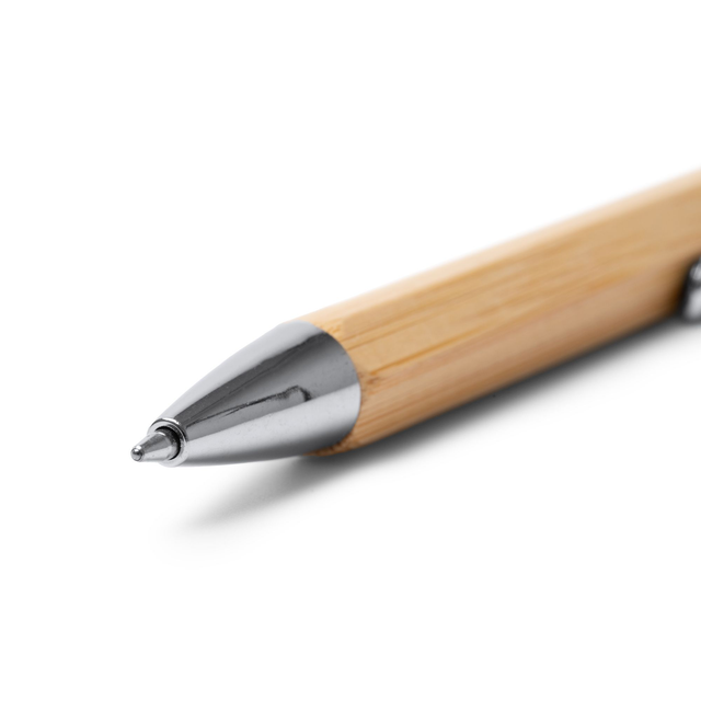 Bolígrafo hexagonal con cuerpo y pulsador de bambú. Detalles cromados. Tinta azul.