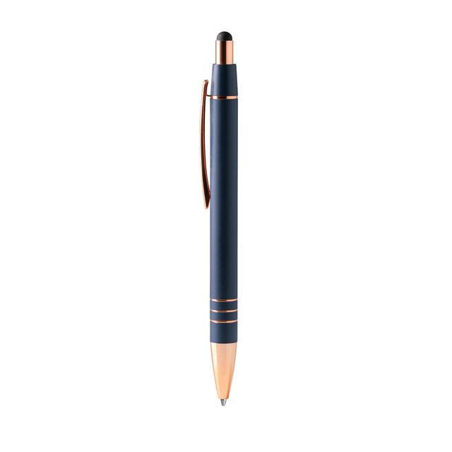 Bolígrafo pulsador con cuerpo metálico en mate y detalles en acabado cobre. Puntero táctil en el pulsador en color negro. Carga jumbo de tinta azul.