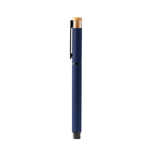 Bolígrafo tipo roller con cuerpo de aluminio reciclado, clip metálico y detalle transparente en la tapa combinado con detalle en bambú. Con detalles en el cuerpo y clip en color negro. Carga jumbo de tinta azul.
