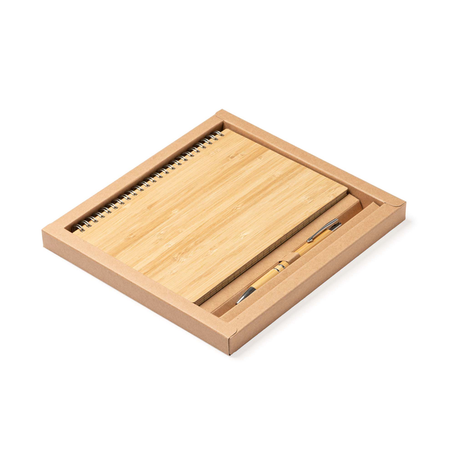 Set libreta A5 y bolígrafo de bambú. Libreta con tapas rígidas, 80 hojas de papel reciclado a una raya. Bolígrafo con detalles cromados y tinta azul.