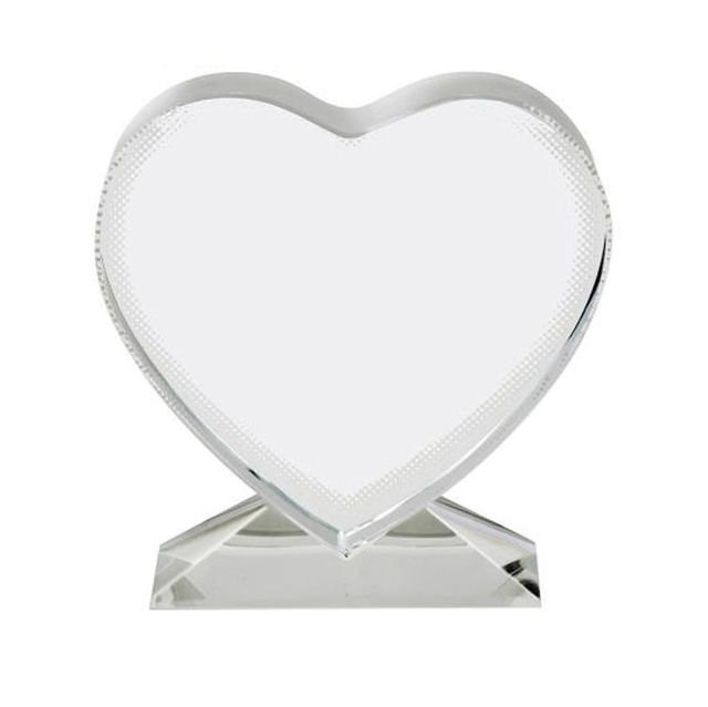 Bonito y decorativo portaretratos de cristal transparente con forma de corazón, grueso y peana de sujeción de forma poliédrica, también en cristal.
