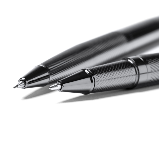 Set compuesto por roller y portaminas de mecanismo giratorio. Realizados en metal de diseño oscurecido. Presentación en estuche de polipiel acolchado con forro interior.